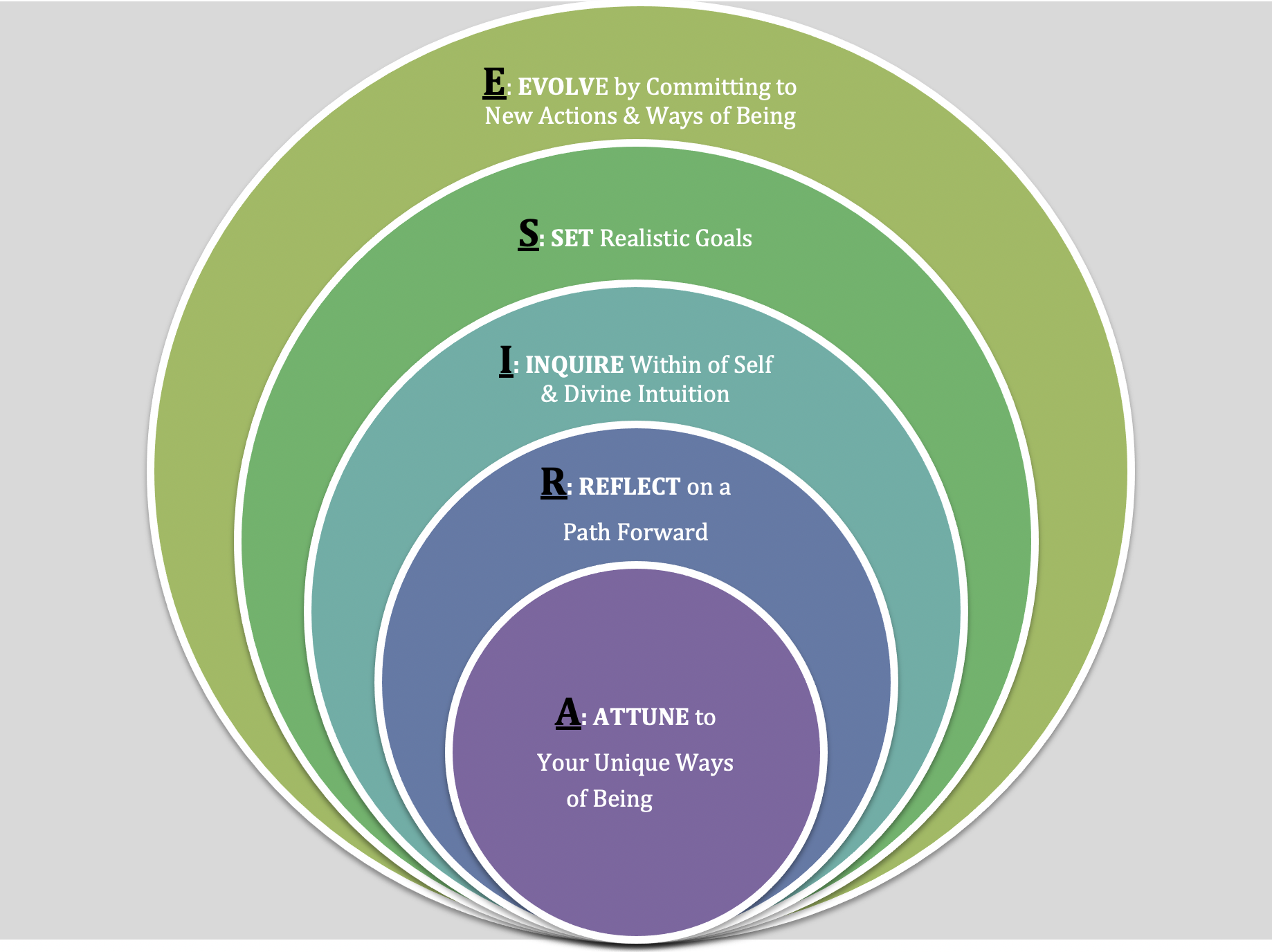 The graphic depicts the interrelationship of the various stages of the ARISE© model. Notice how each successive stage increases and expands outward like rippling water. This movement mirrors the client’s journey from attuning to herself (the foundational inner work) to her evolution as reflected in her growth and transformation (the outward expression in the world). As the client deepens her self-knowledge and self-awareness, she increasingly takes up space and influences the world around her.